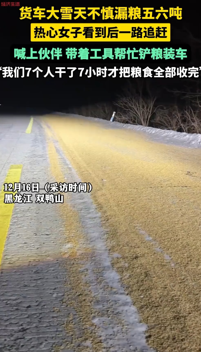 货车大雪天不慎漏粮五六吨,热心女子看到后一路追赶,喊上伙伴带着工具帮忙铲粮装车