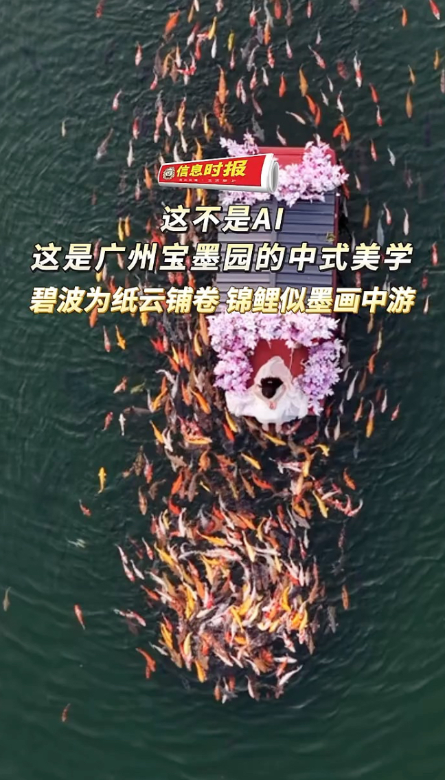 这不是AI,这是广州宝墨园的中式美学。网友拍到宝墨园“锦鲤成群绕轻舟”的画面