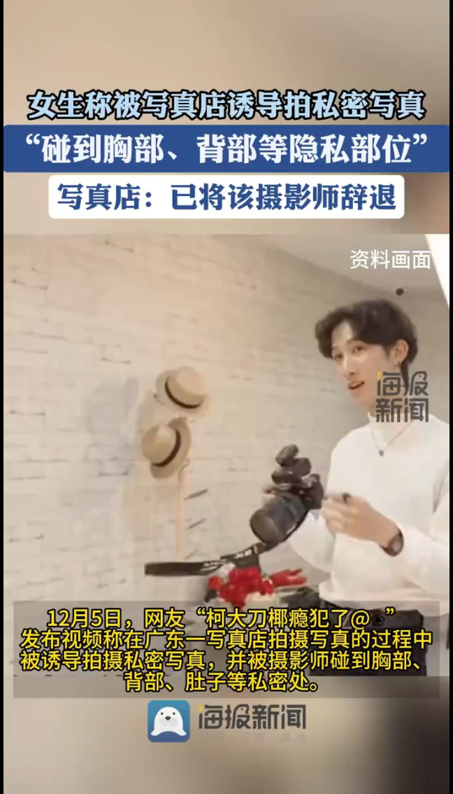 女生举报遭写真店诱导拍私密照后被碰隐私部位 涉事商家回应称:已辞退摄影师