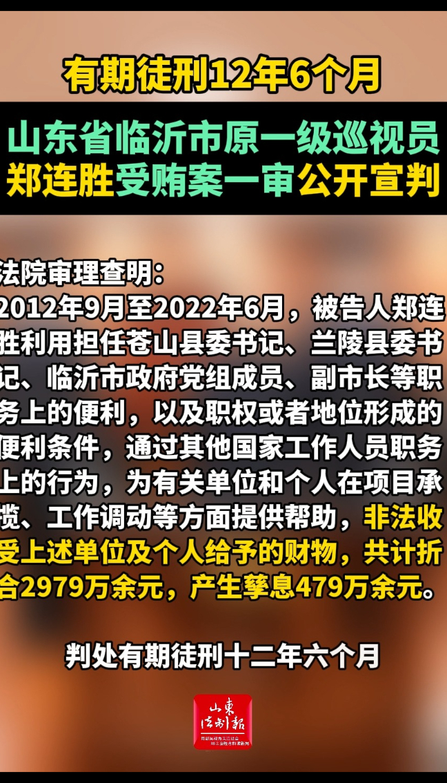 有期徒刑12年6个月!山东省临沂市原一级巡视员郑连胜受贿案一审公开宣判