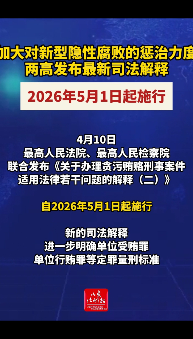 加大对新型隐性腐败的惩治力度 两高发布最新司法解释 2026年5月1日起施行