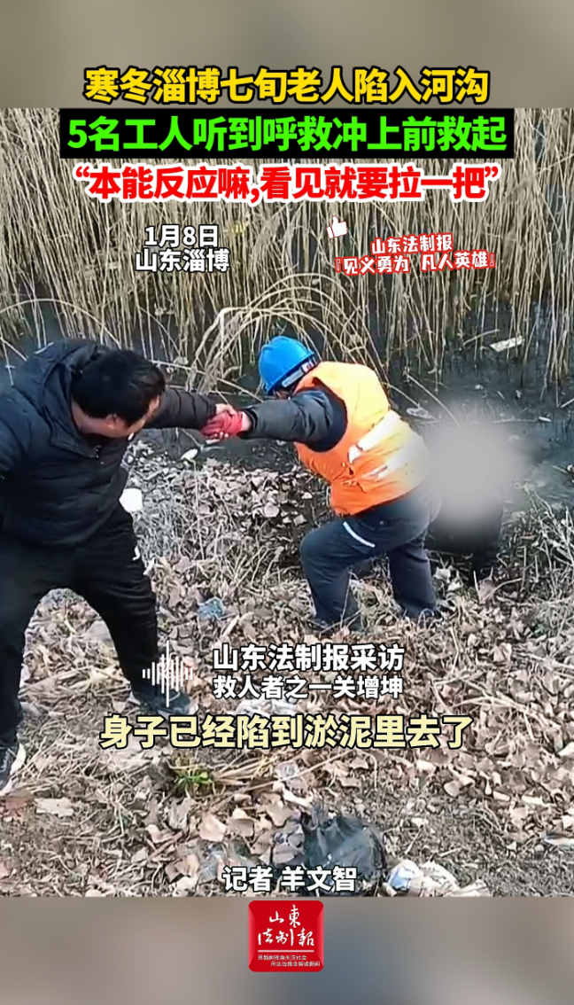 寒冬淄博七旬老人陷入河沟,5名工人听到呼救冲上前救起,“本能反应嘛,看见就要拉一把”
