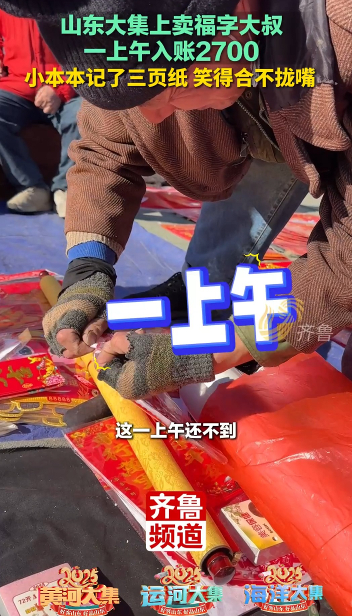 山东大集上卖福字大叔一上午入账2700,笑得合不拢嘴