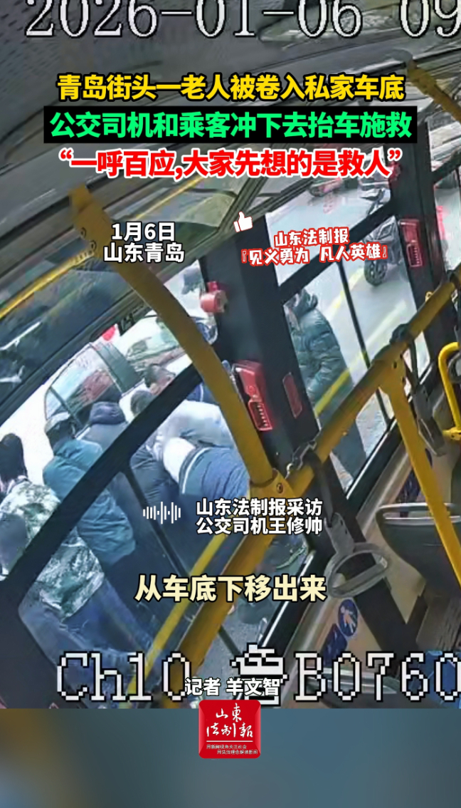 青岛街头一老人被卷入私家车底,公交司机和乘客冲下去抬车施救,“一呼百应,大家先想的是救人”