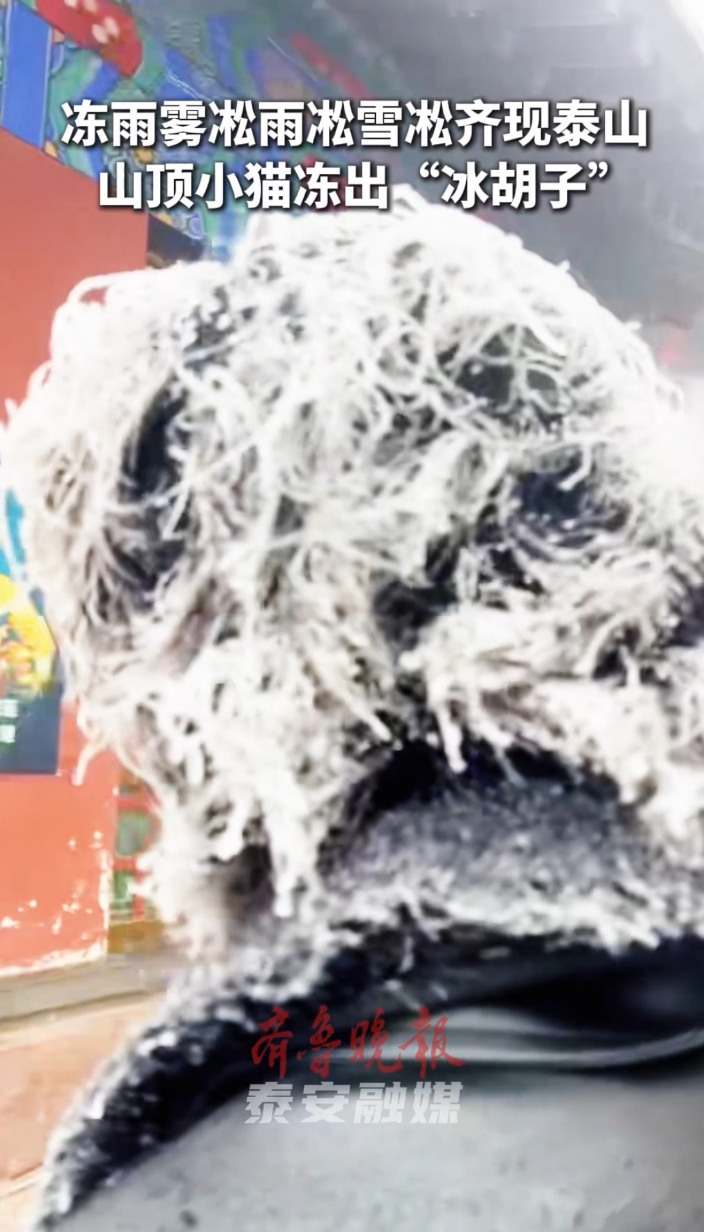 果然视频|冻雨雾凇雨凇雪凇齐现泰山,山顶小猫冻出“冰胡子”