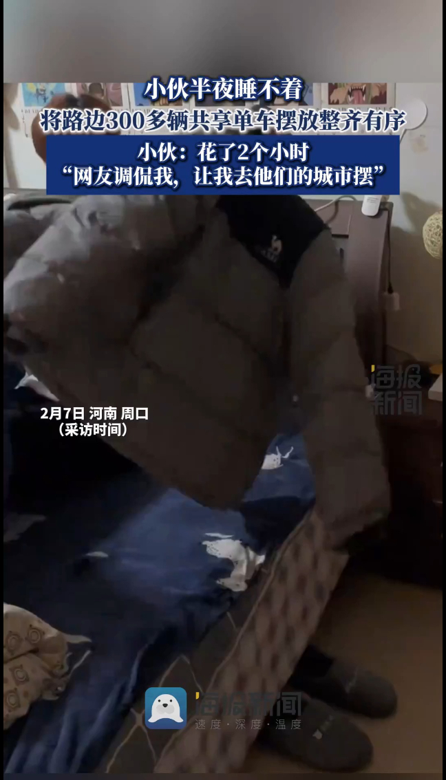 小伙半夜将路边300多辆共享单车摆放整齐有序:“花了2个小时 ,网友调侃我,让我去他们的城市摆”