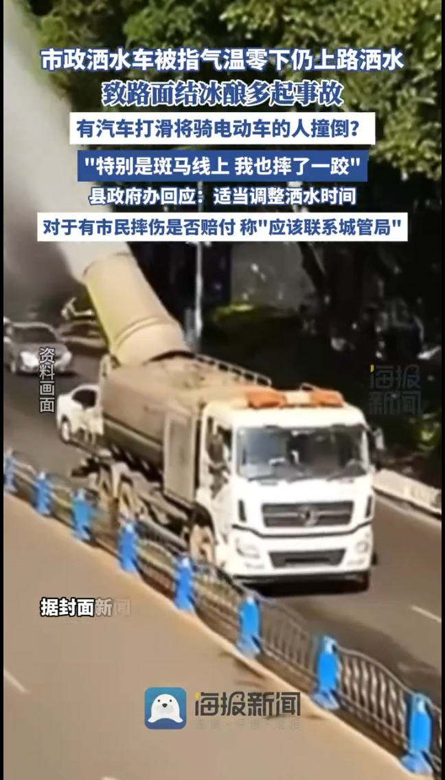 洒水车被指冷天零度以下洒水,致路面结冰酿多起事故,当地回应