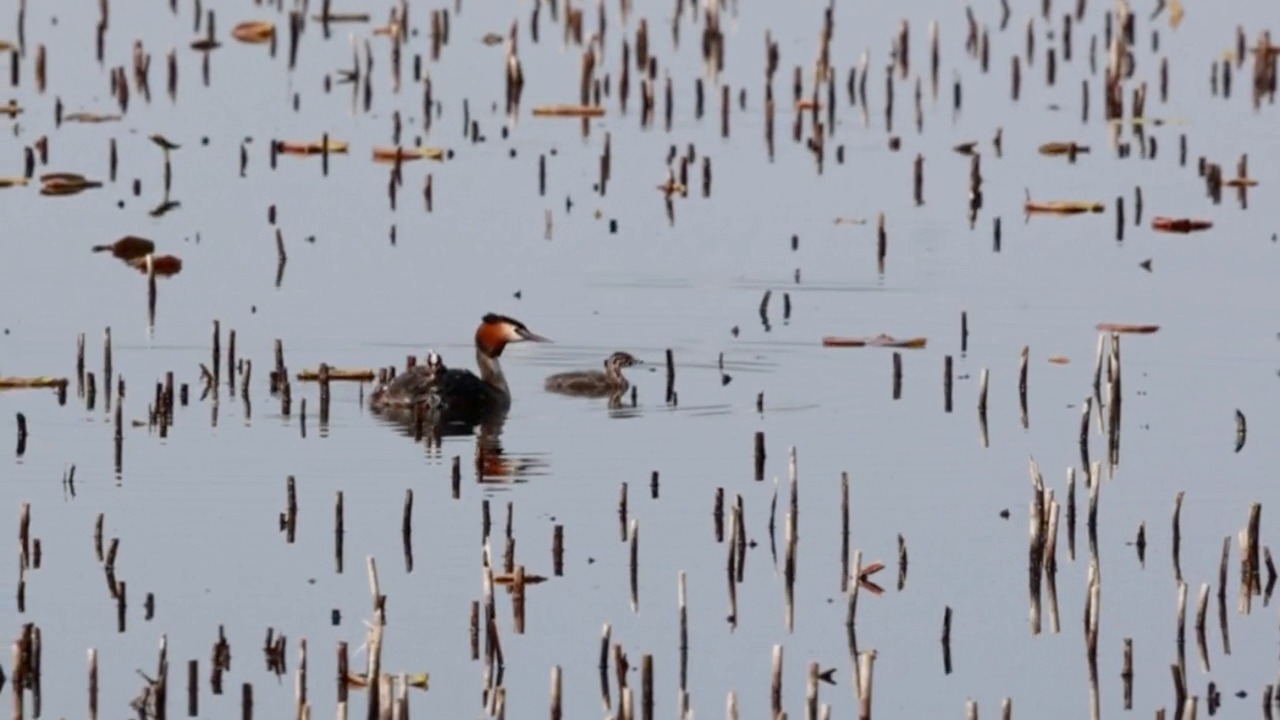 初夏的华山湖,碧波微漾。一对凤头鸊鷉夫妻正上演着这世间最温柔