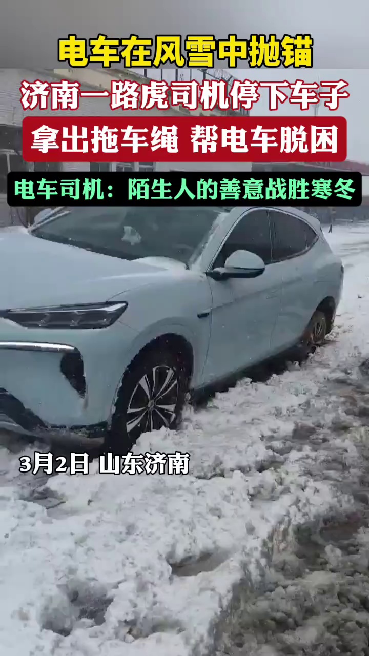 电车在雪中抛锚,路虎司机二话不说帮其脱困。