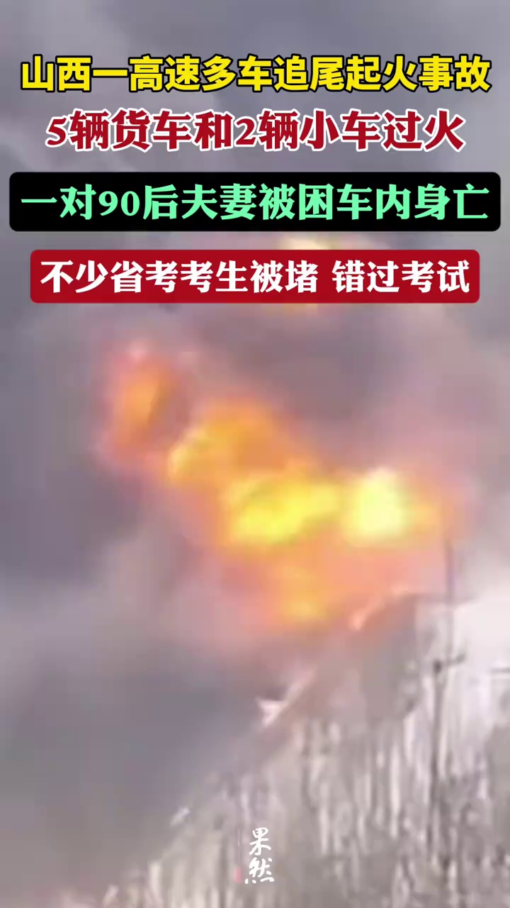 这对90后夫妻驾车追尾前方小车,之后一辆拉百货的货车又尾随相撞起火,明火快速蔓延至其它车辆,据统计有5辆货车和2辆小车过火。