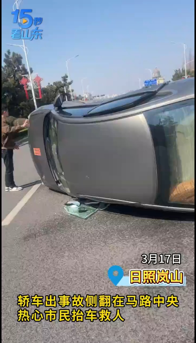 15秒看山东丨日照一轿车翻车,热心群众抬车救人