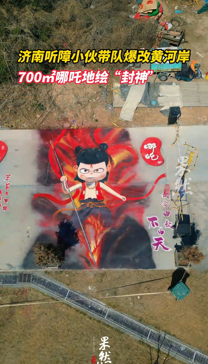 果然视频|听障小伙带队爆改黄河岸,700㎡哪吒地绘“封神”