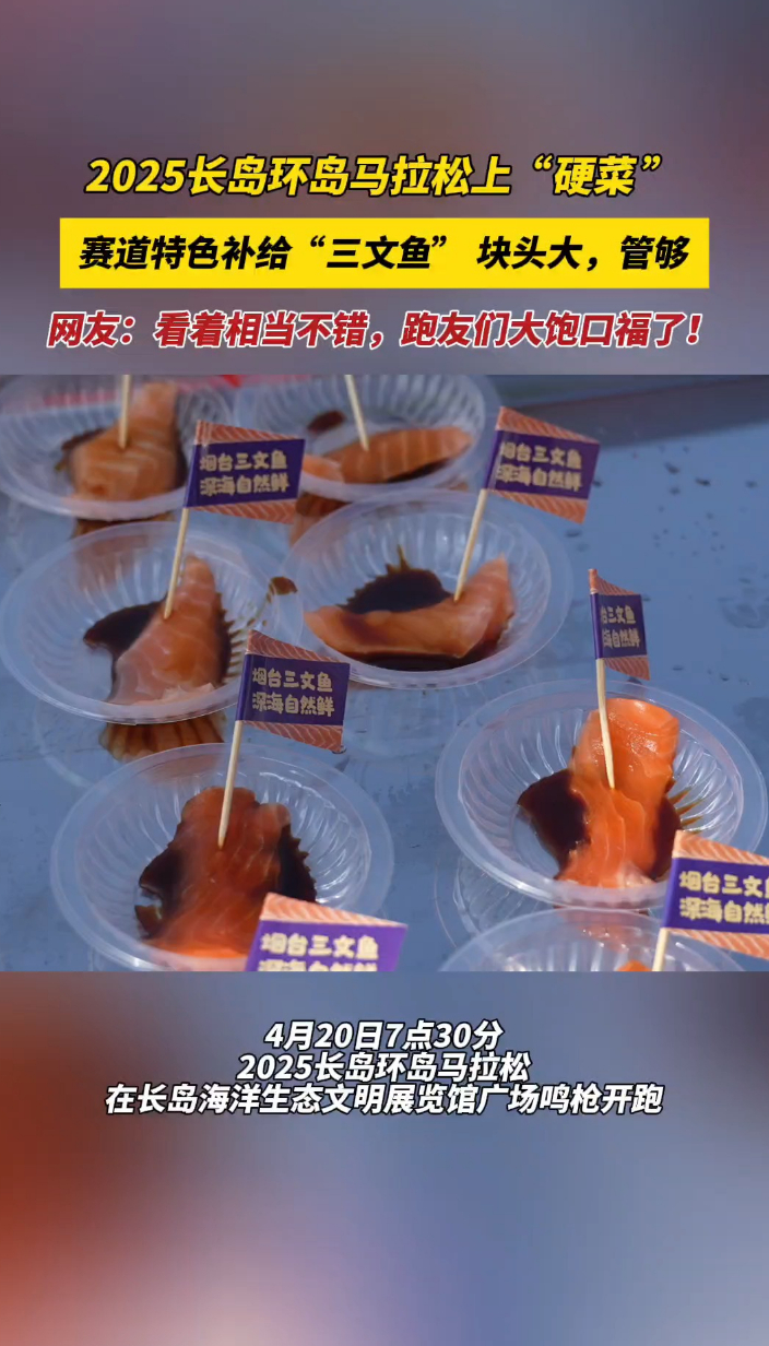 果然视频|长岛环岛马拉松上“硬菜”,特色补给三文鱼管够吃