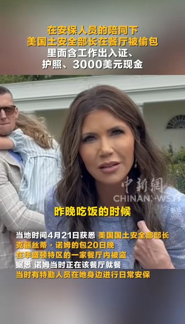 在安保人员的陪同下,美国土安全部长在餐厅被偷包