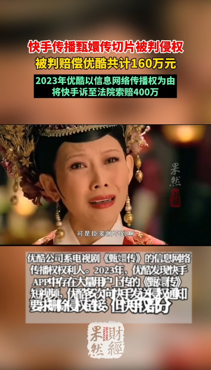 果然财经|赔偿优酷共计160万元,快手传播甄嬛传切片被判侵权