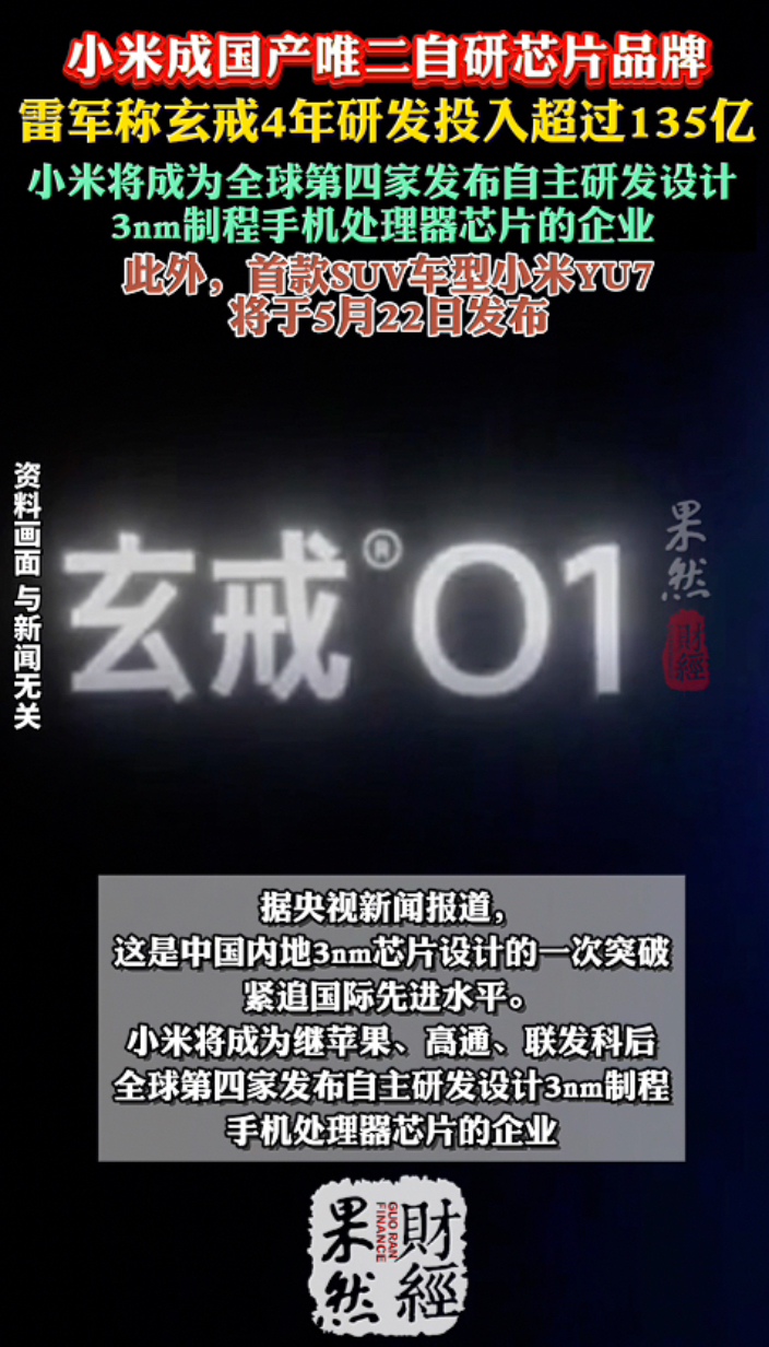 果然财经|小米自研芯片投入135亿,成国产唯二自研芯片品牌