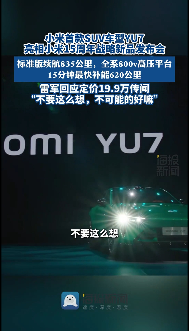 小米首款SUV车型YU7亮相小米15周年战略新品发布会,雷军回应定价19.9万传闻 :“不要这么想,不可能的好嘛”
