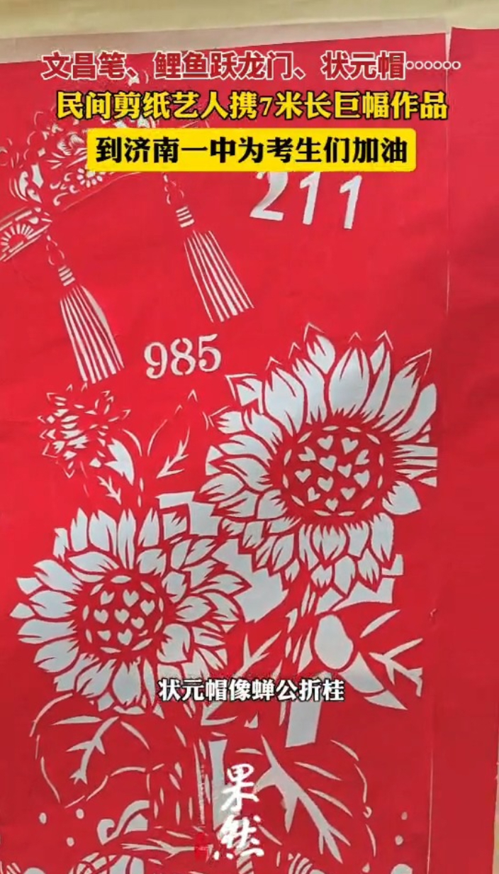 果然视频丨文昌笔、状元帽……济南民间剪纸艺人携巨幅作品到考点为考生加油
