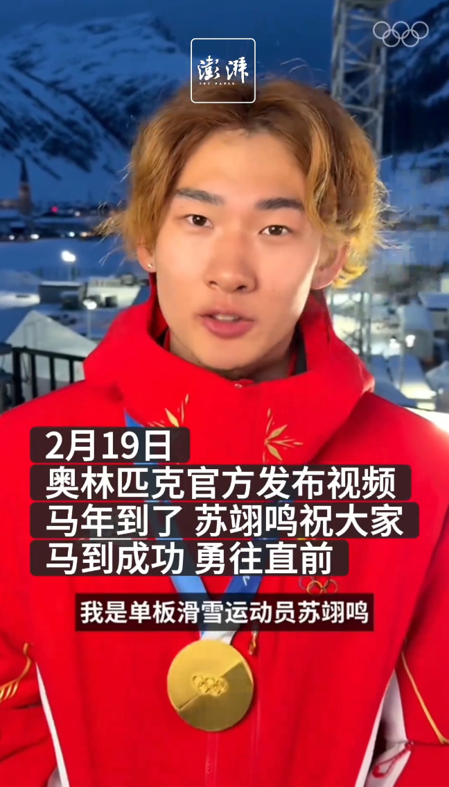 苏翊鸣戴着金牌送上新年祝福:祝大家马到成功、勇往直前