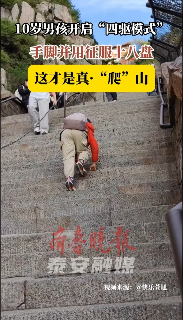 果然视频|10岁男孩解锁爬泰山新姿势,手脚并用征服十八盘