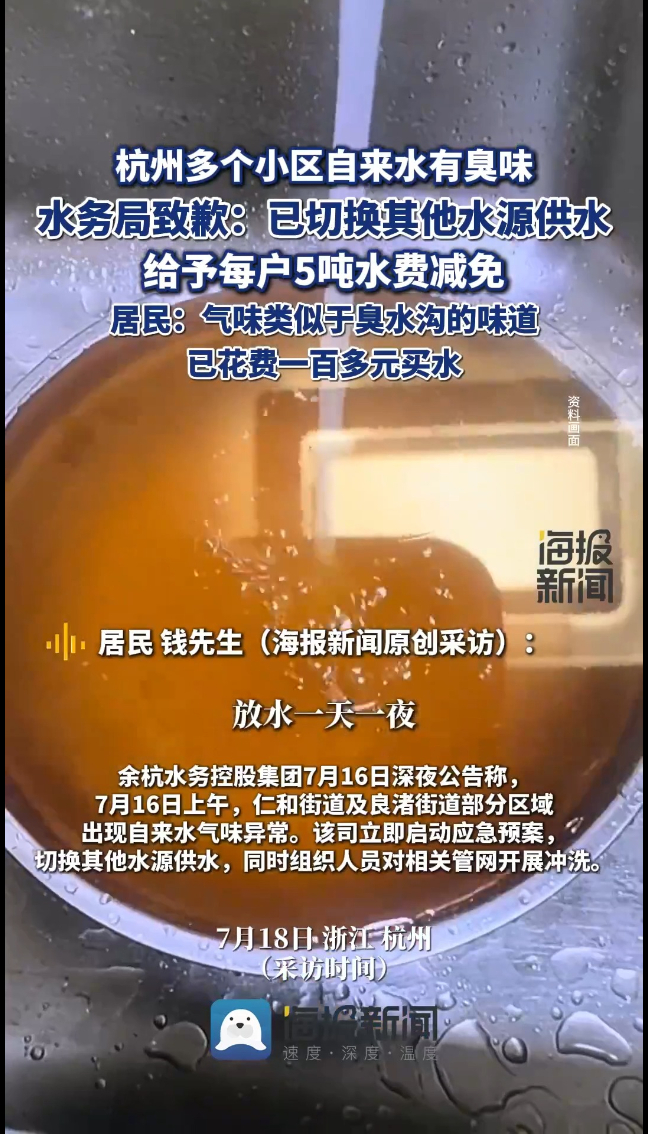 杭州多个小区自来水有臭味,水务局致歉给予每户5吨水费减免,居民:气味类似于臭水沟的味道,已花费一百多元买水
