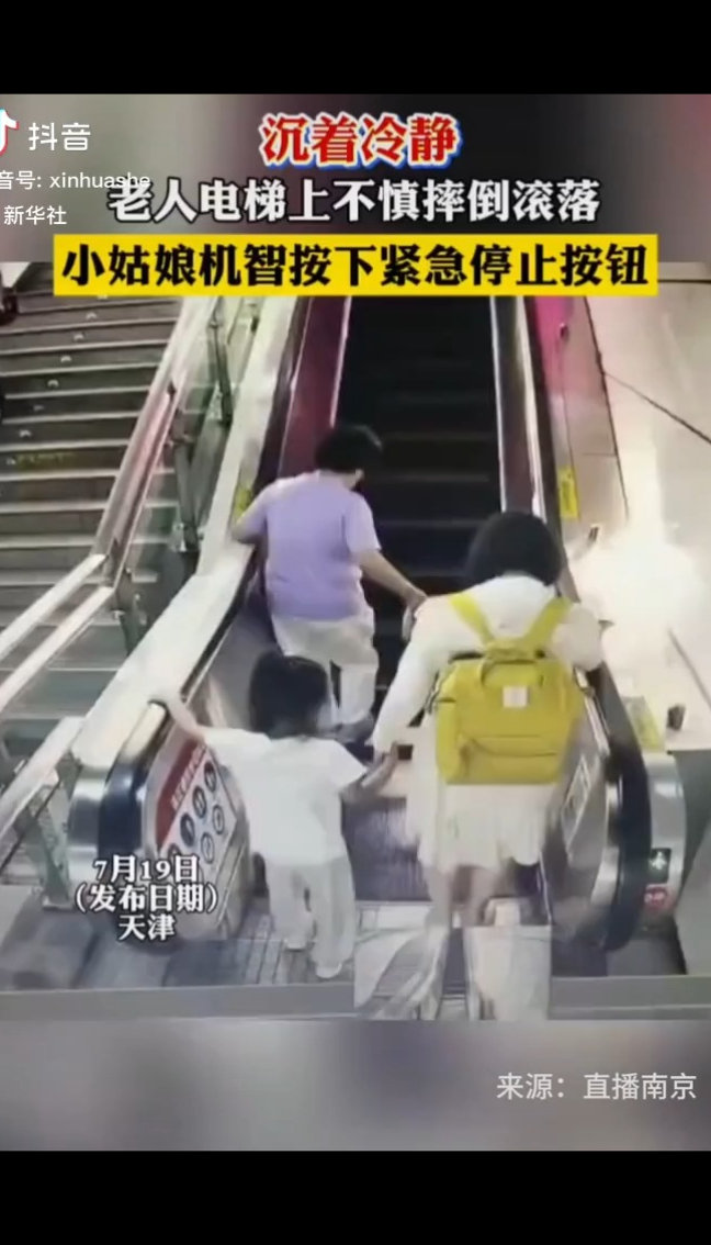 多亏了她!老人扶梯上不慎摔倒,女孩被撞翻后机智按停电梯
