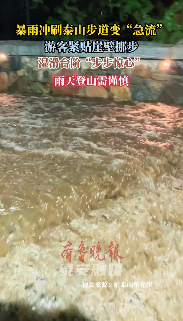 果然视频|暴雨冲刷泰山步道变“急流”,游客紧贴崖壁挪步,湿滑台阶“步步惊心”雨天登山需谨慎