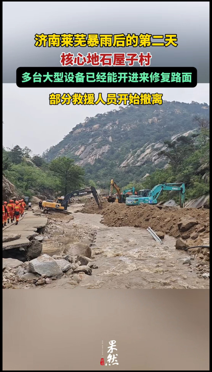 果然视频|莱芜石屋子村暴雨后第二天,大型设备已进驻修复路面