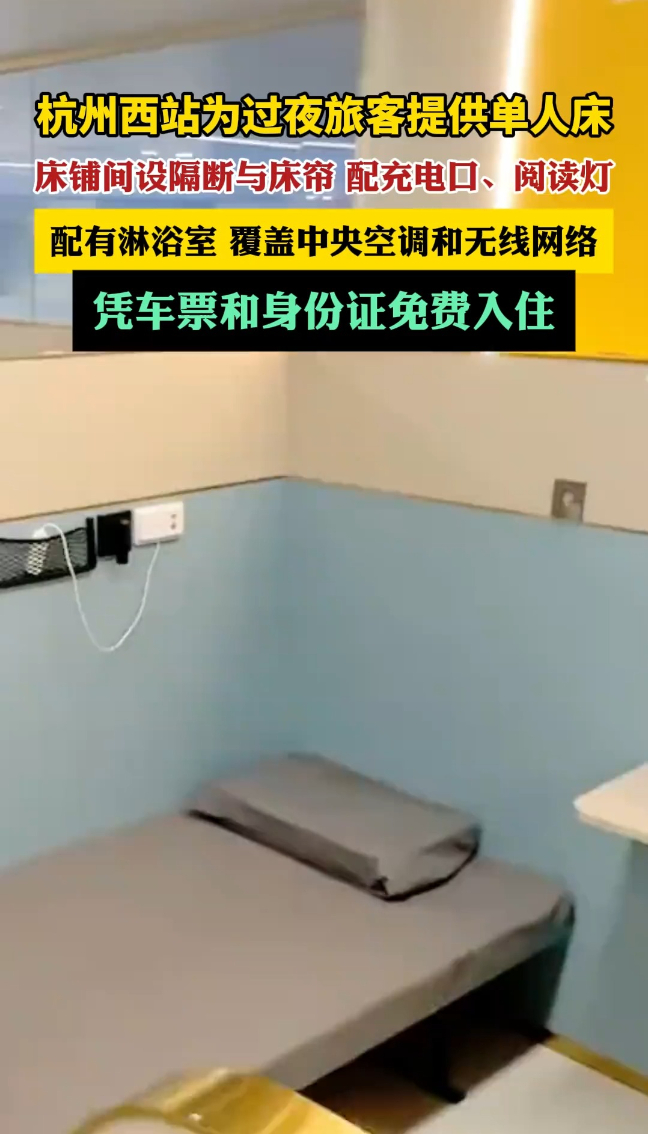 杭州西站为过夜旅客提供单人床,覆盖中央空调和WiFi,凭车票和身份证免费入住