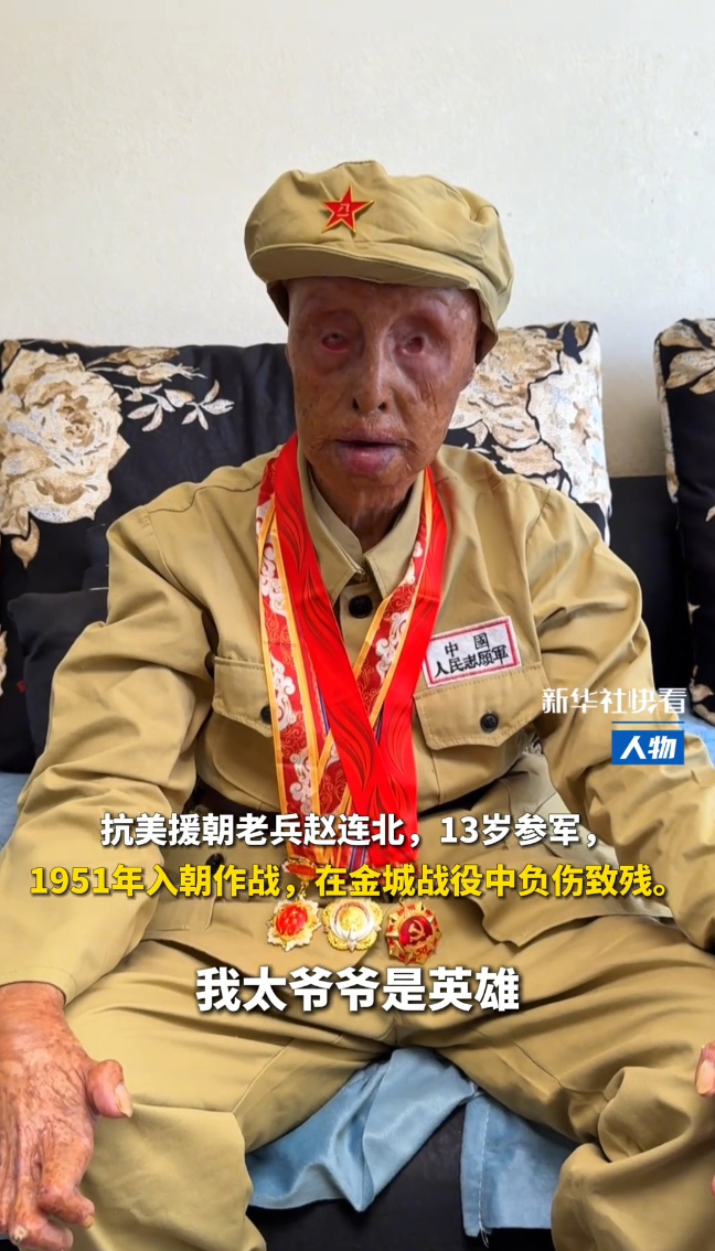“我不害怕,我太爷爷是英雄!”93岁抗美援朝老兵赵连北,战斗中毁容,全身80%烧伤
