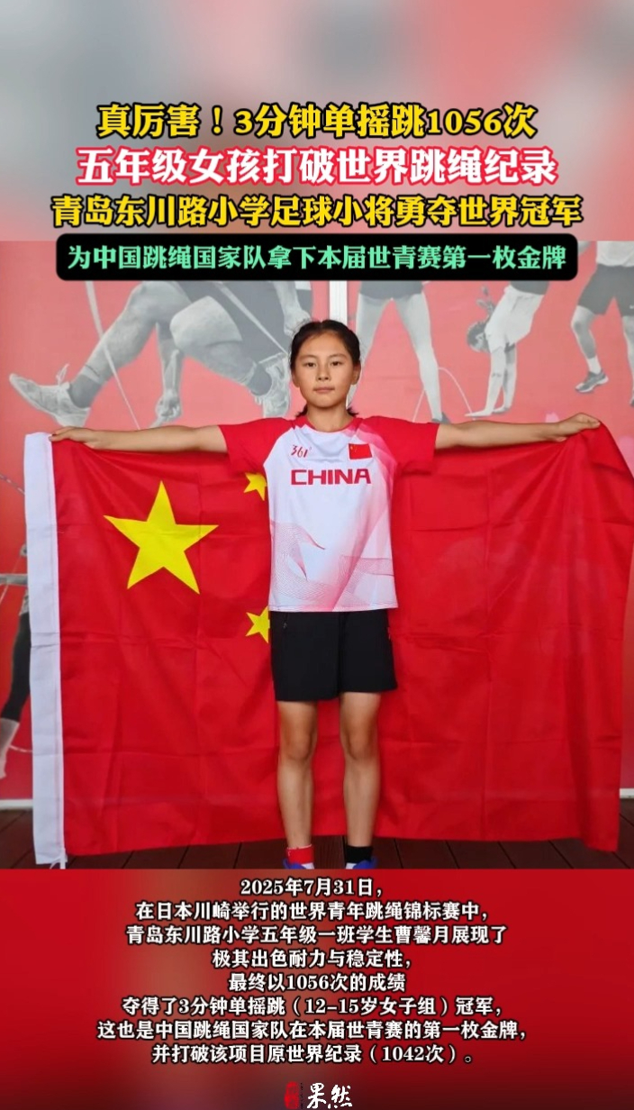 果然视频|厉害!青岛五年级女孩破世界跳绳纪录夺冠