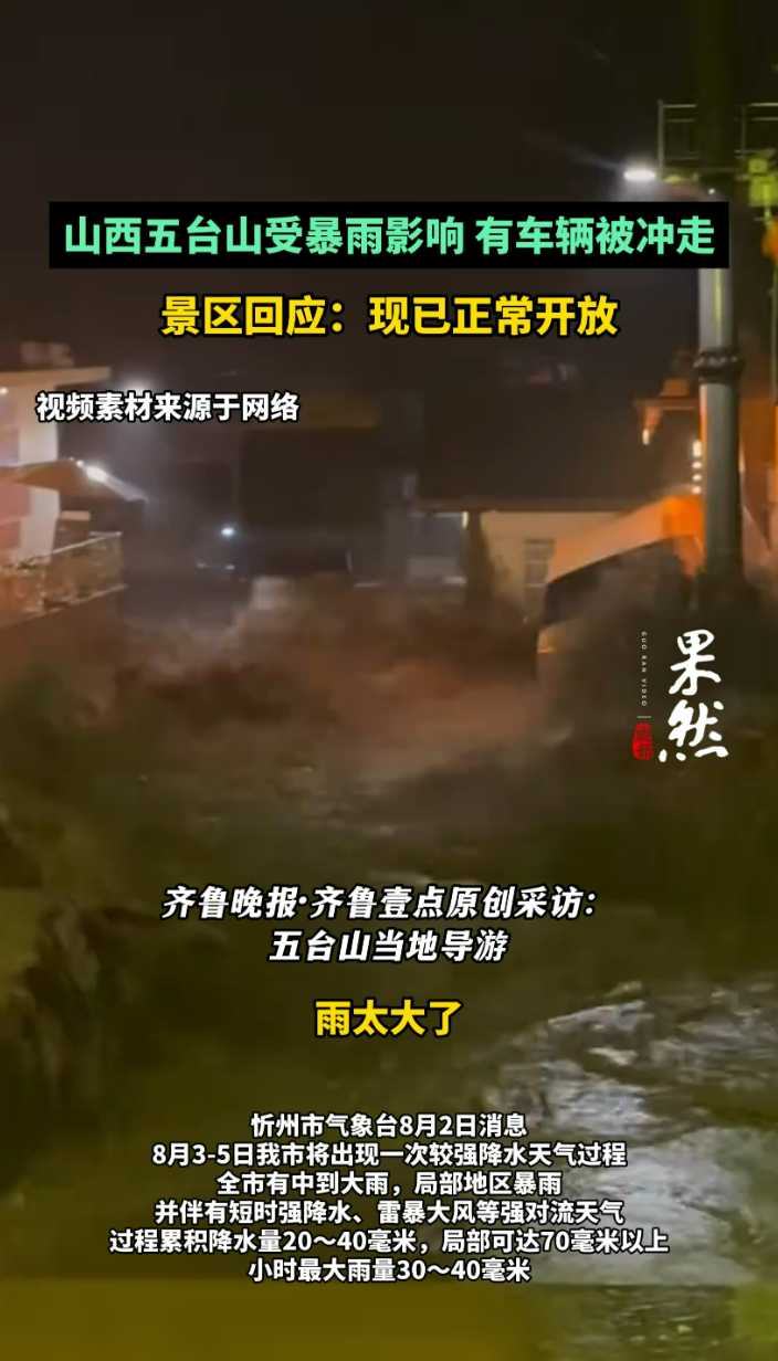 果然视频|受暴雨影响山西五台山有车辆被冲走,景区:现已开放