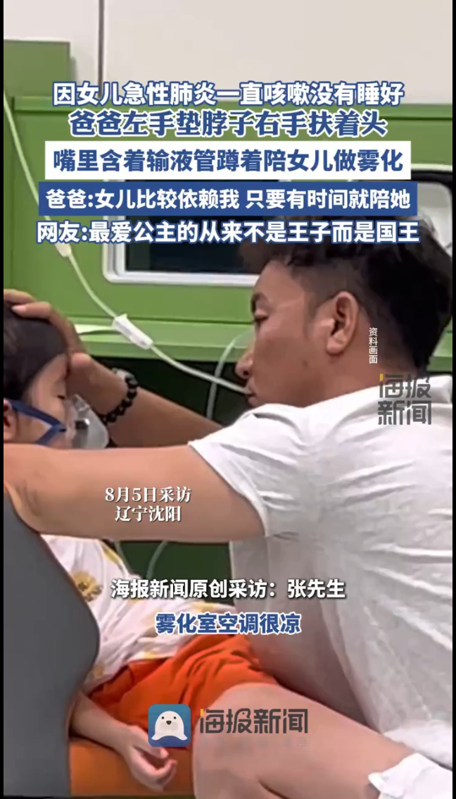 爸爸嘴里含着输液管蹲着陪女儿做雾化