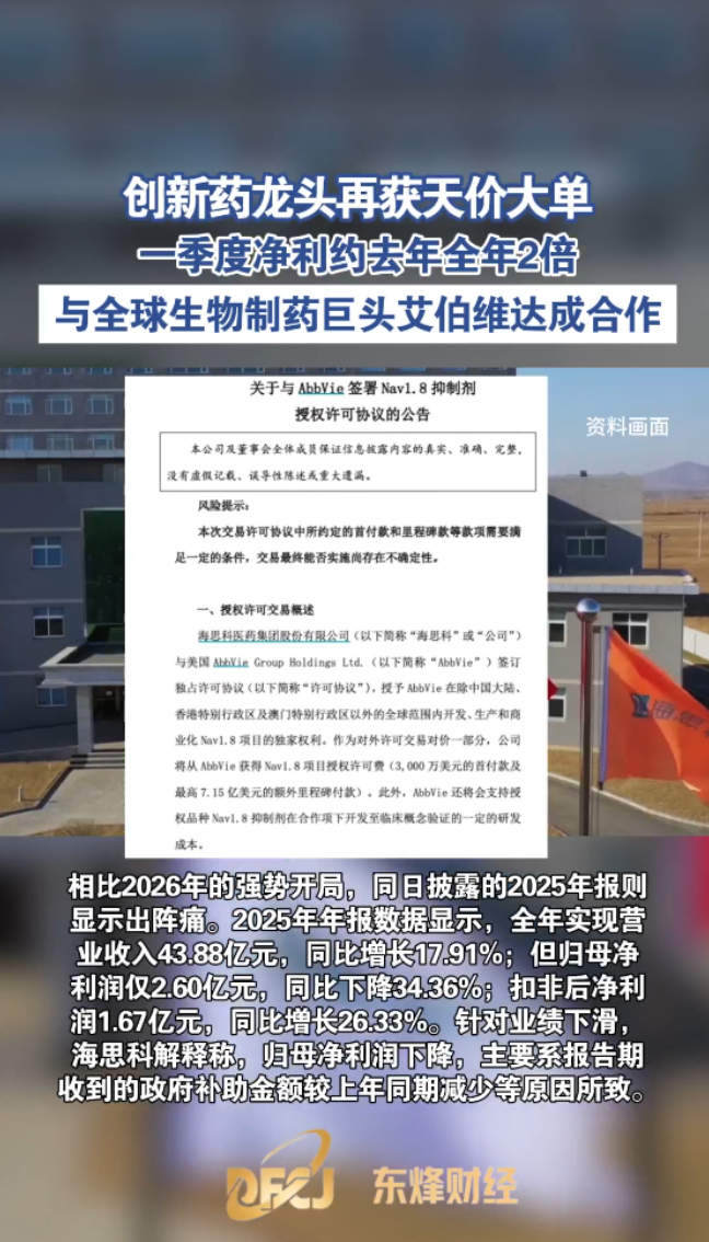 东烽财经丨创新药龙头再获天价大单,一季度净利约去年全年2倍,与全球生物制药巨头艾伯维达成合作