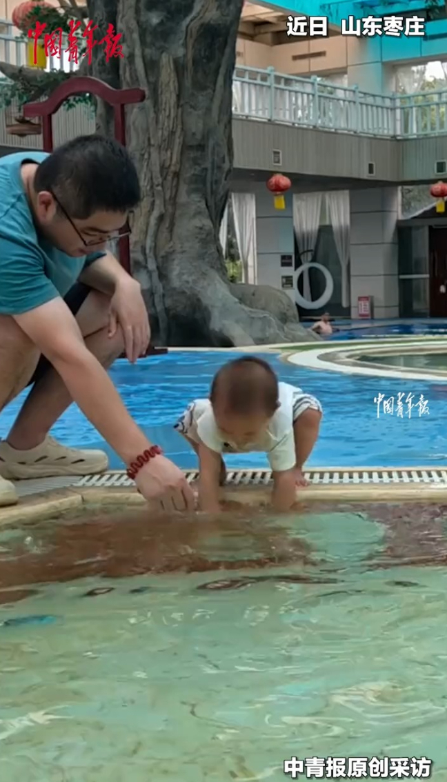 爸爸带孩子玩水,孩子不慎掉落水中,爸爸眼疾手快瞬间救起