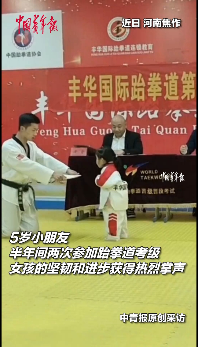 从尝试十几次才完成到一次成功,5岁小朋友半年间两次参加跆拳道考级,女孩的坚韧和进步获得热烈掌声