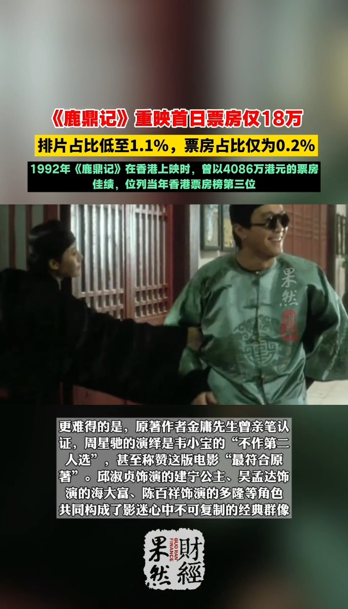 果然财经|《鹿鼎记》首日票房仅18万,排片占比低至1.1%