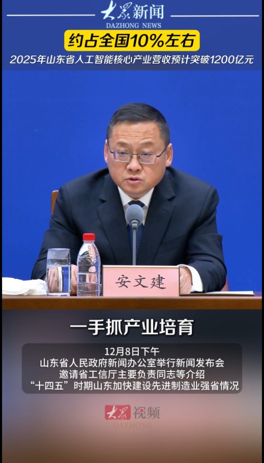 约占全国10%左右,2025年山东省人工智能核心产业营收预计突破1200亿元