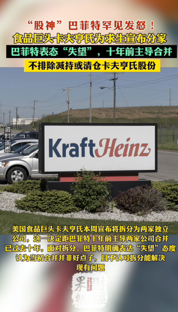 果然财经|食品巨头卡夫亨氏宣布分家,“股神”巴菲特罕见发怒