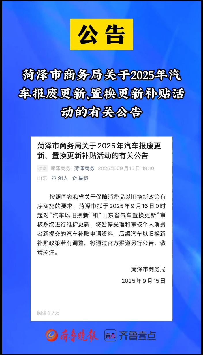 菏泽将暂停受理和审核个人消费者新提交的汽车补贴申请资料
