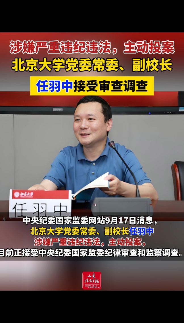 涉嫌严重违纪违法,主动投案 北京大学党委常委、副校长任羽中接受审查调查