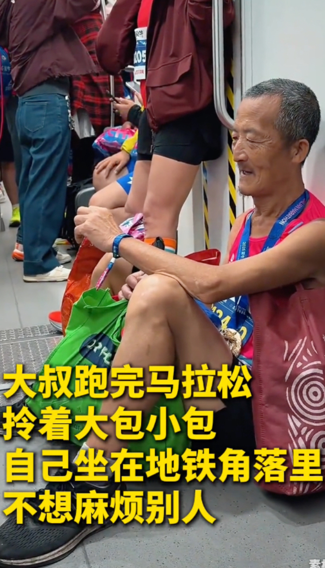 这一幕让人心疼!70多岁大叔跑完马拉松坐在地铁角落里,不想麻烦别人
