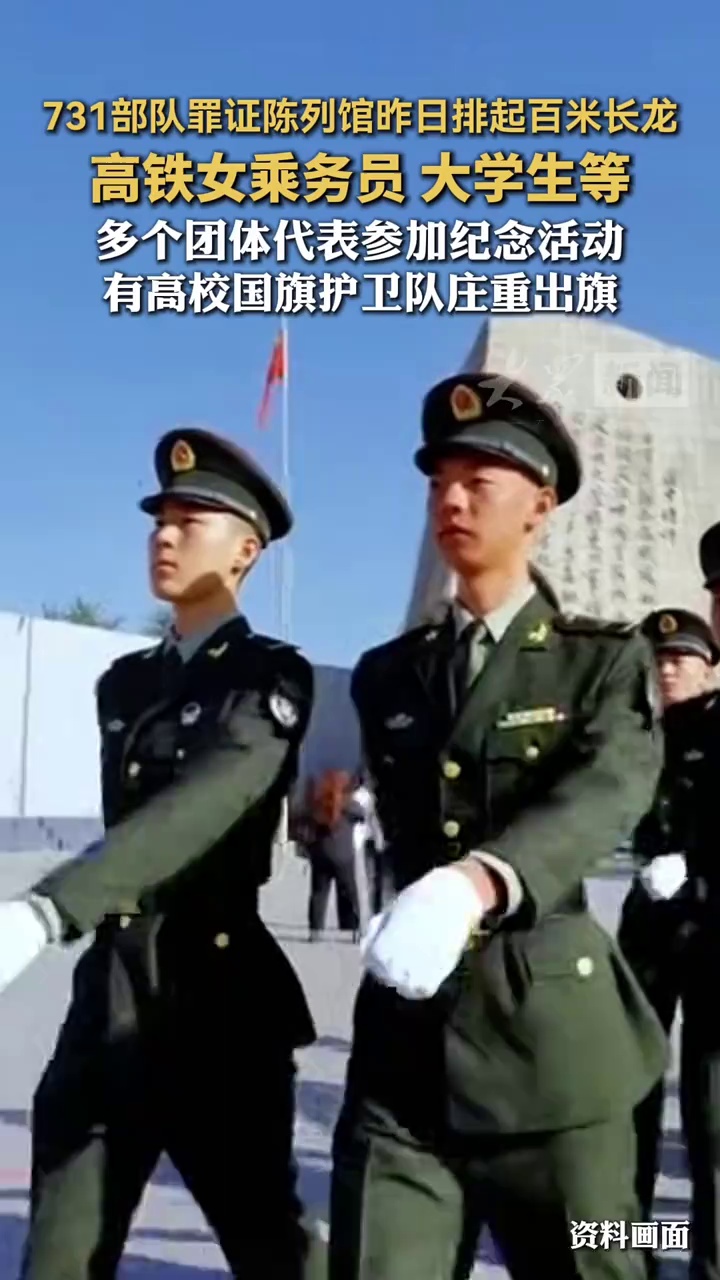 731部队罪证陈列馆昨日排起百米长龙,高铁女乘务员、大学生等多个团体代表参加纪念活动,有高校国旗护卫队庄重出旗!#731 #731罪证陈列馆 #勿忘九一八撞钟鸣警 #勿忘九一八吾辈当自强