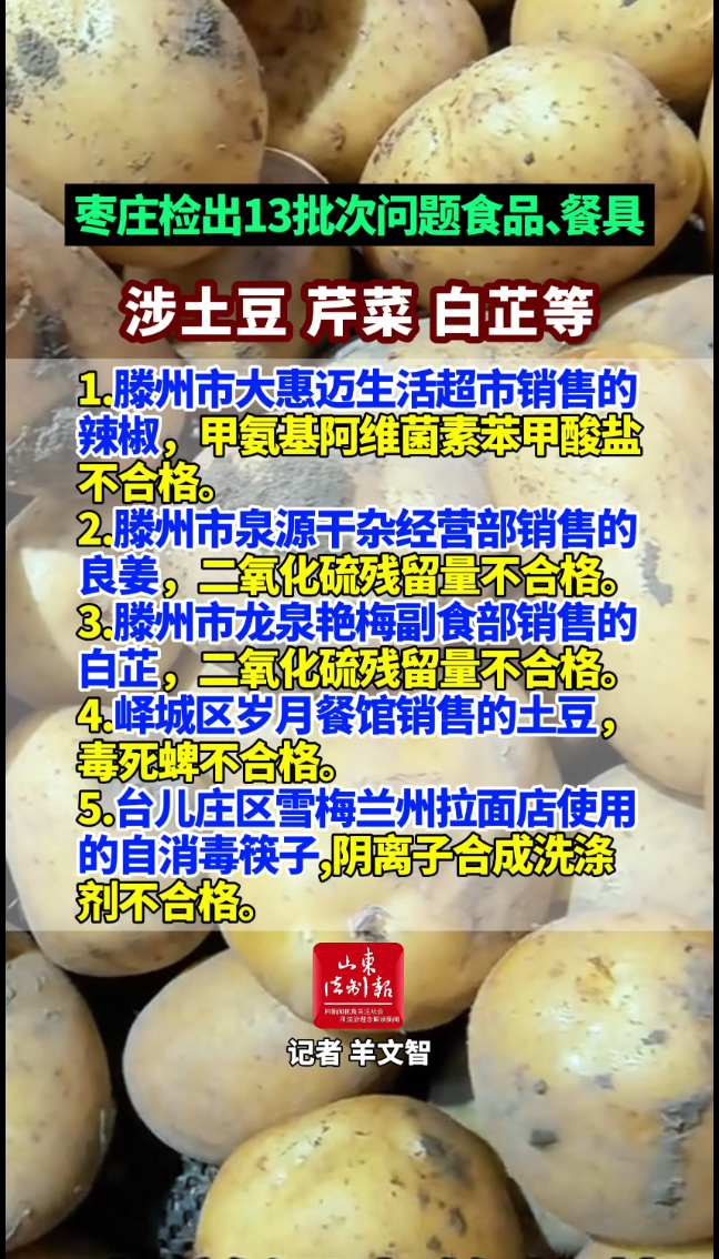 枣庄检出13批次问题食品、餐具,涉土豆、芹菜、白芷等