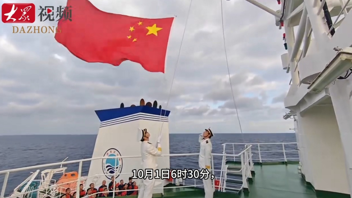 中国海洋大学“东方红3”船在东海海域科考:海上升国旗,祝福祖国好