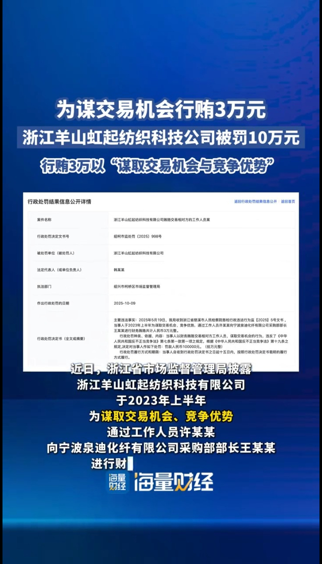 海量财经丨为谋交易机会行贿3万元 浙江羊山虹起纺织科技公司被罚10万元