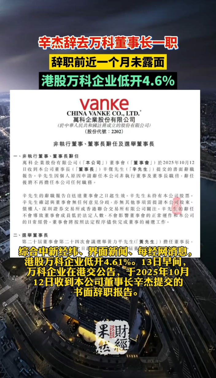 果然财经|万科突发!辛杰辞职,黄力平出任董事长