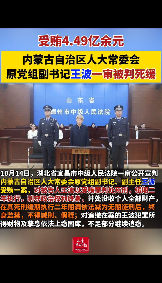 受贿4.49亿余元 内蒙古自治区人大常委会原党组副书记王波一审被判死缓