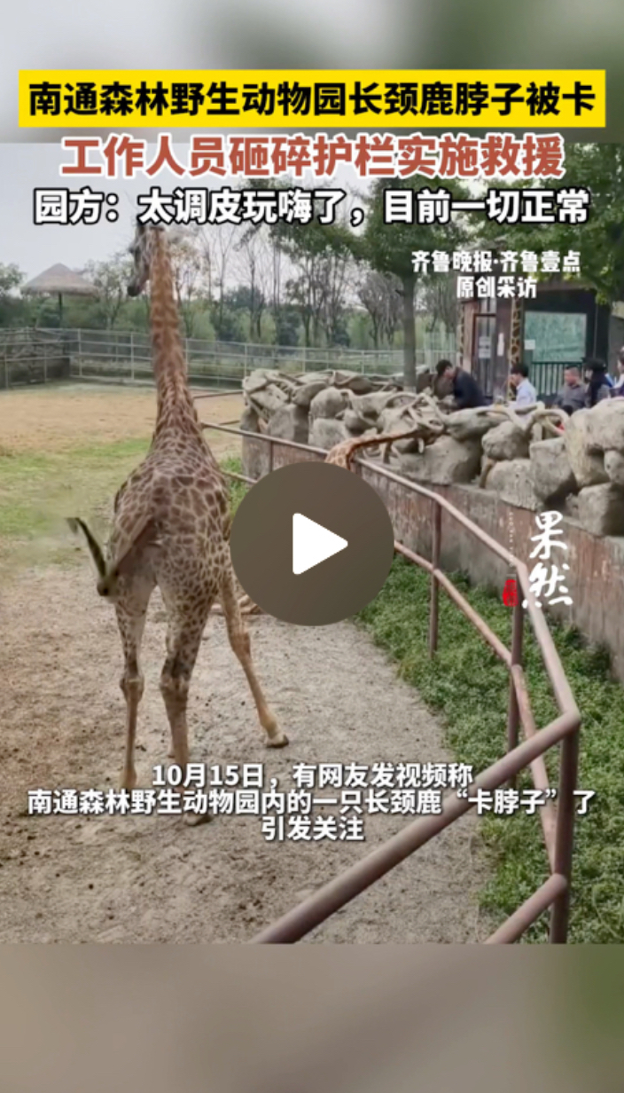 果然视频|南通森林野生动物园长颈鹿脖子被卡,工作人员砸碎护栏实施救援,园方回应