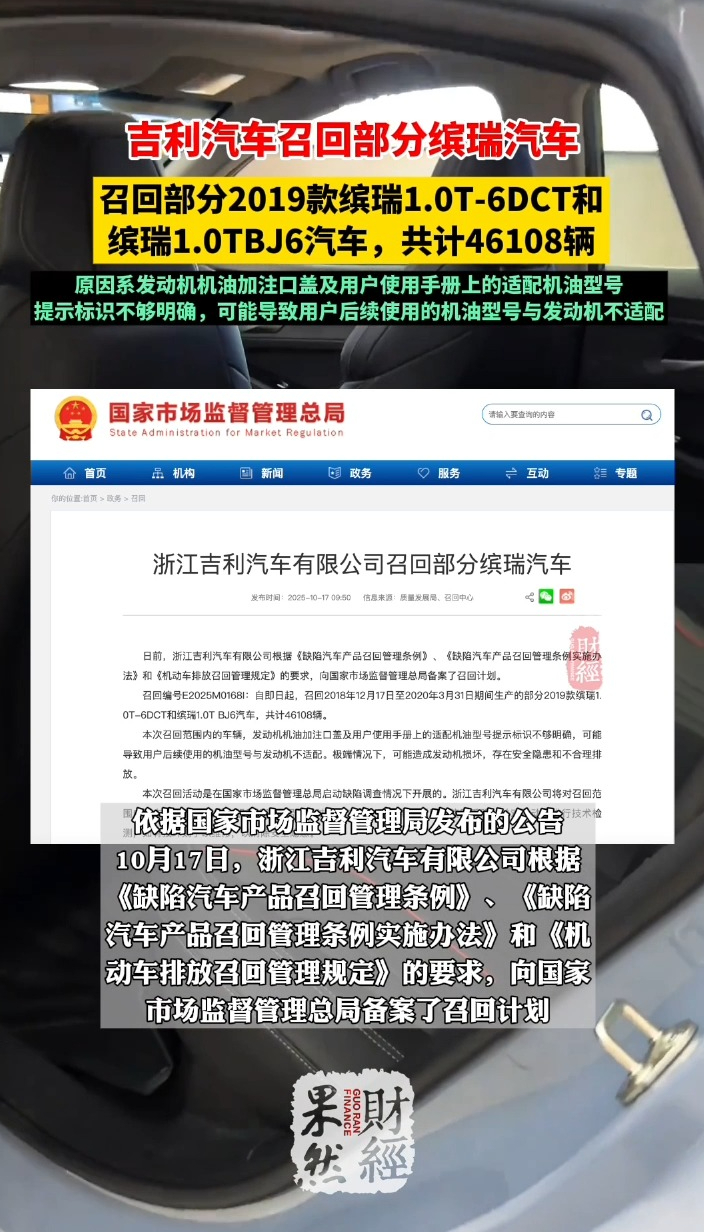 果然财经|吉利汽车召回部分缤瑞汽车,共计46108辆